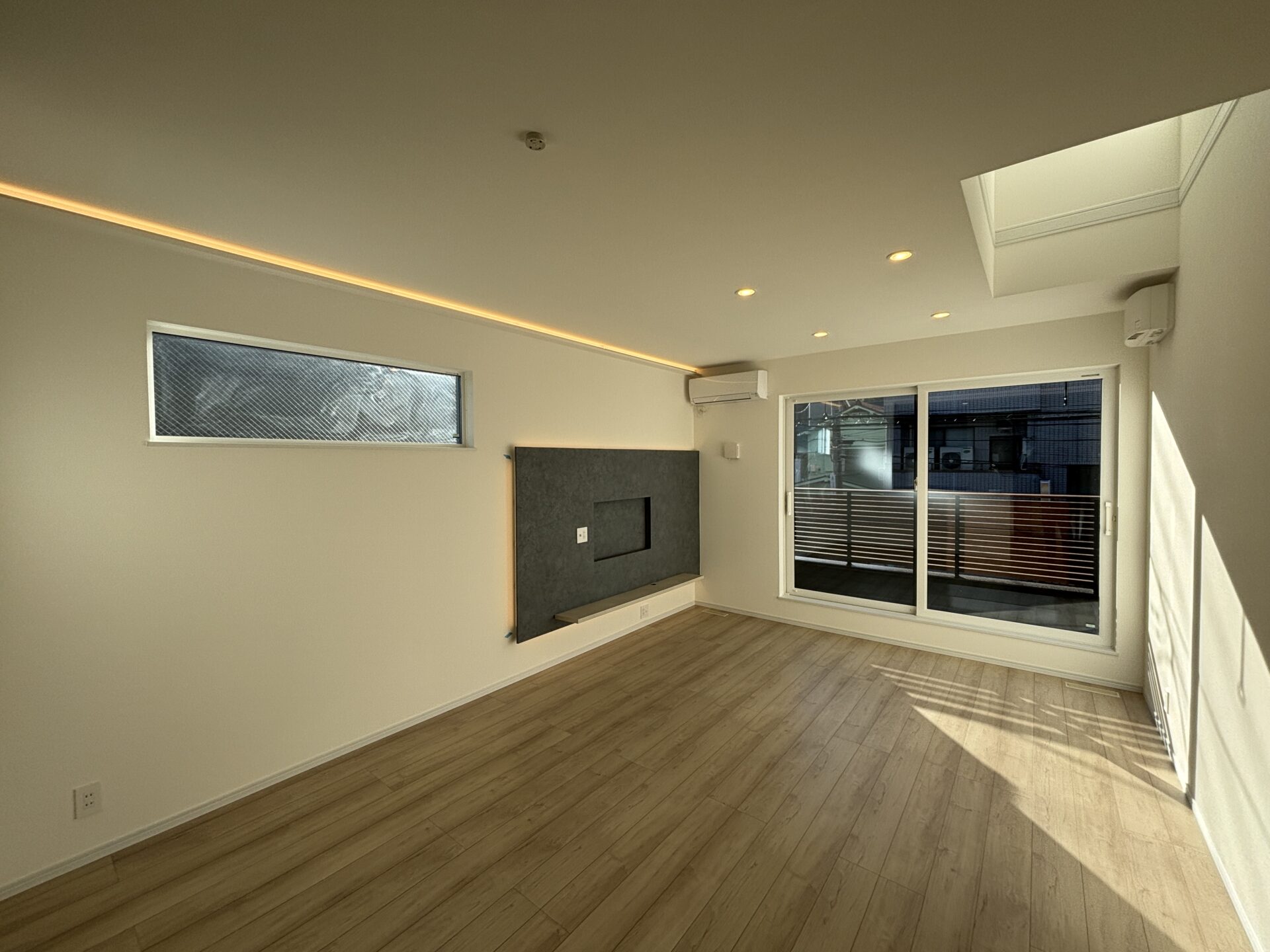 天井にはライン照明、壁掛けテレビのバッグボードには間接照明をあしらいました。