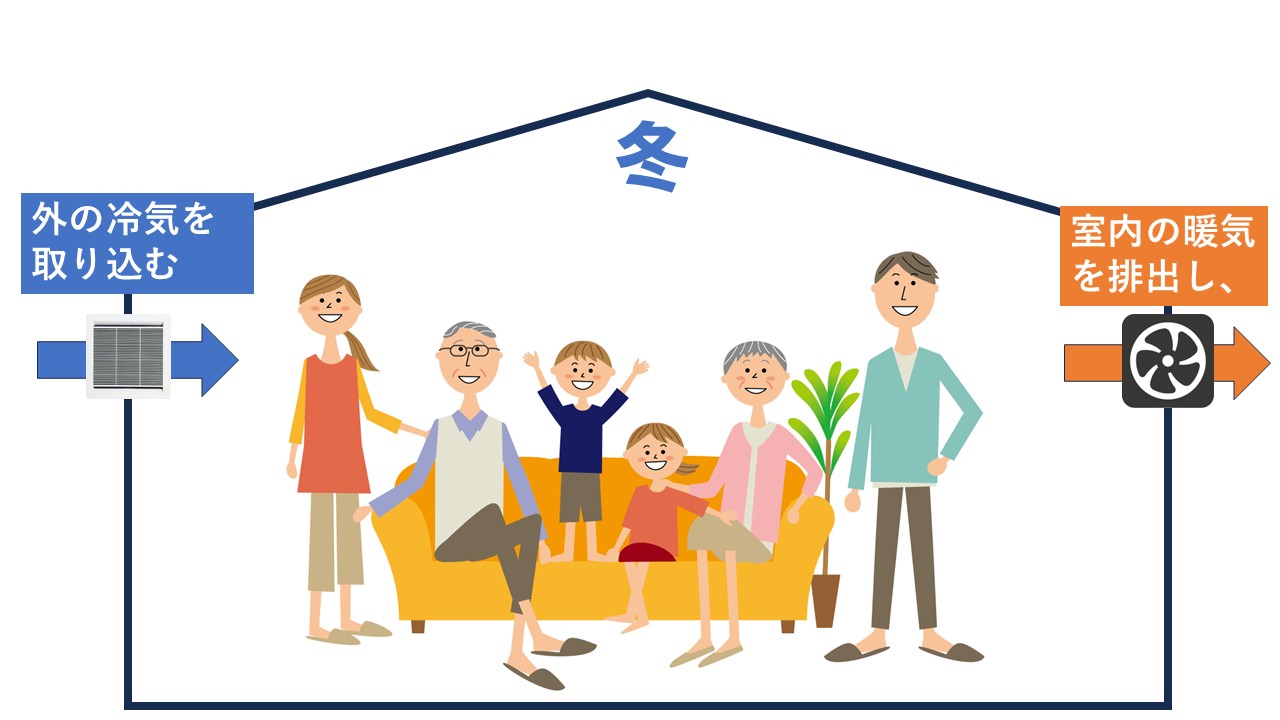 真冬は反対に、せっかく温めた室内の空気を外に吐き出し、0℃に近い冷気を室内に取り込むことになるのです。