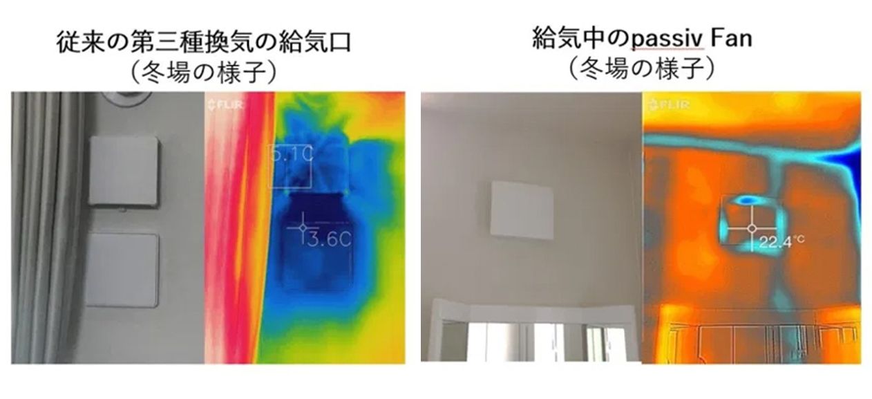 左が一般的な換気扇、中央部は3.6℃。パッシブファンを装着した右側は、22.4℃をキープしています。