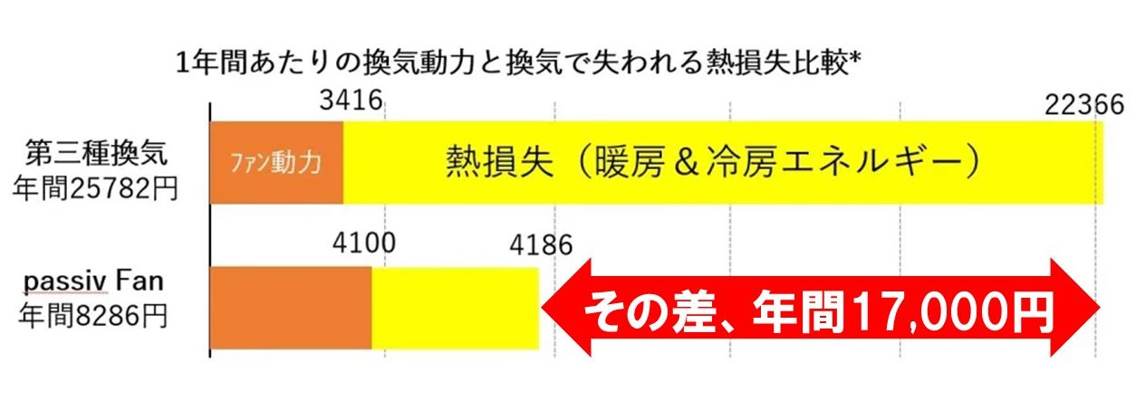 パッシブファンのメリットは、換気による冷暖房効果の低減を大きく抑えるため、より快適に暮らせる上、当然省エネにつながるため、メーカーによると、年間の削減コストは、17000円にもなると試算されています。