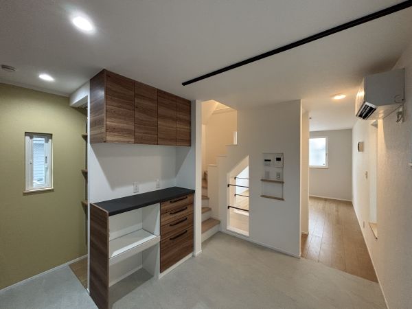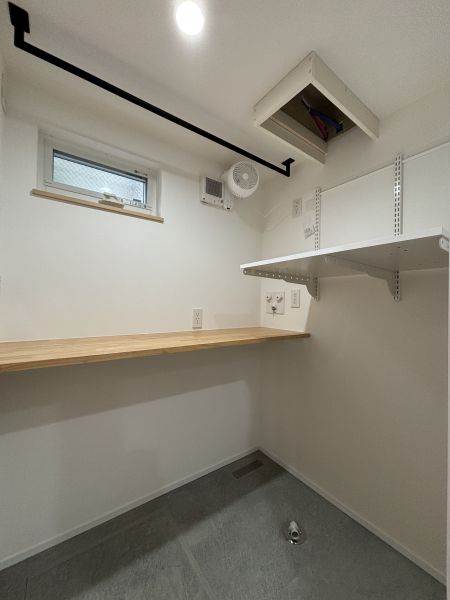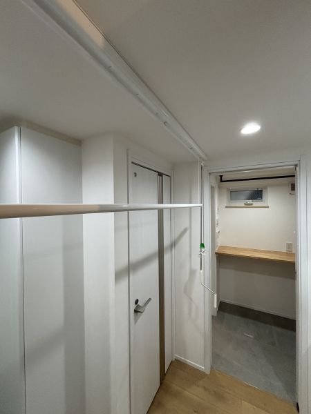 玄関ホールには、昇降式の天井吊り下げ物干しを設置。