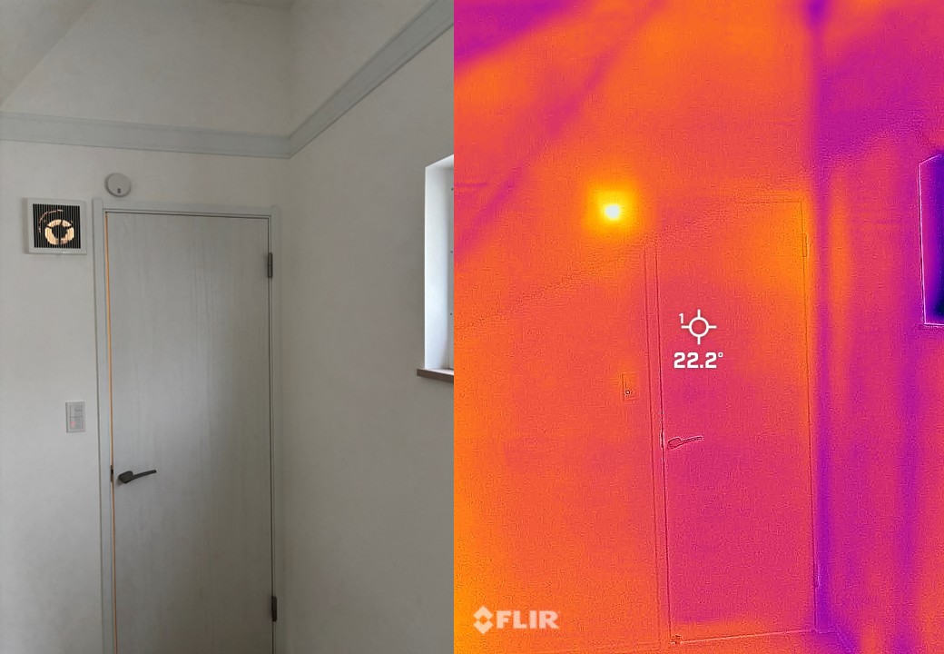 室内ドアの左上のエアパス、サーモカメラの画像を見ると、暖気が入ってきているのがわかります。