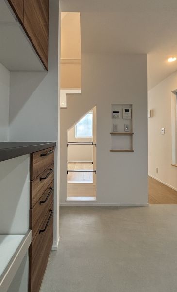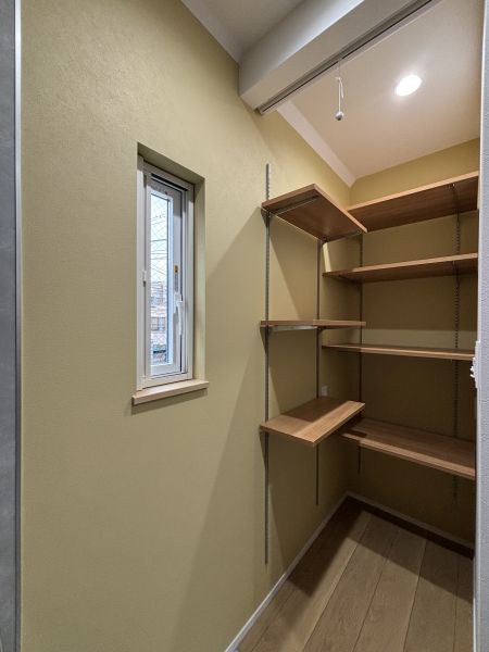 カップボードの裏にパントリーを設け、収納スペースをしっかり確保しています。