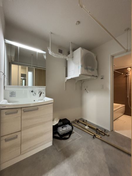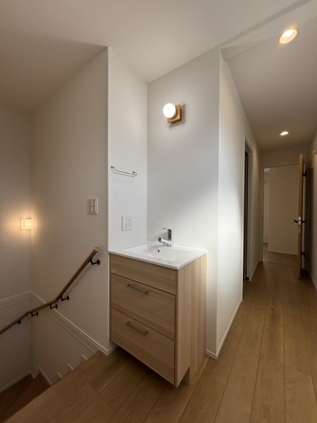 そこで、3階ホールの限られたスペースに、階段室側に向けたセカンド洗面台を設置しました。