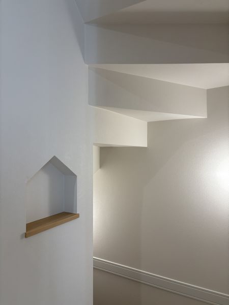 1階から2階リビングに上がる階段室にパントリーとお揃いの家のカタチをしたニッチを設けました。