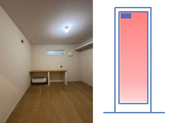 床下エアコンは、1階、一番奥の南側のお部屋に設置し、家全体に暖気を届けるようにレイアウトしています。